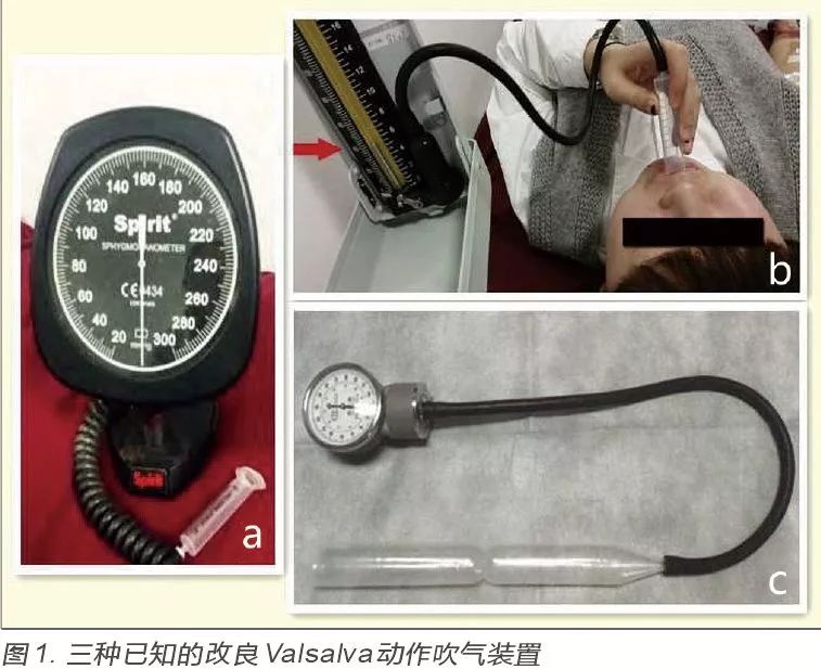 改良Valsalva动作的实施条件,核心就是要有一个能够准确显示吹气压力值的压力计,压力计还需要搭配一个一次性使用的“吹嘴儿”。查阅相关文献资料,最为标准的是使用弹性式盘状压力计图1a,