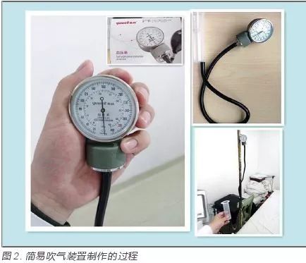 综合上述各吹气装置的特点和优势,找到一种更为简单经济的操作办法,命名为“LP吹气法”。采用图1c的表式血压计作为压计,搭配图1a和1b所使用的一次性50m L针筒作为吹嘴儿。表式血压计售价便宜,以“鱼跃牌”表式血压计为例,售价30~40元/个。拔出50m L针筒的针芯杆,作为吹嘴儿,快速、简便、一次性。血压计的橡胶管就是现成的吹气管道。根据实际需要,可自行调整吹气管道的长度。工作中常遇到氧气管不够长的情况,自行裁剪一段塑料管连接两根吸氧管以延长管道的长度。同样,使用这种方法也可以实现增加吹气管道的长度。