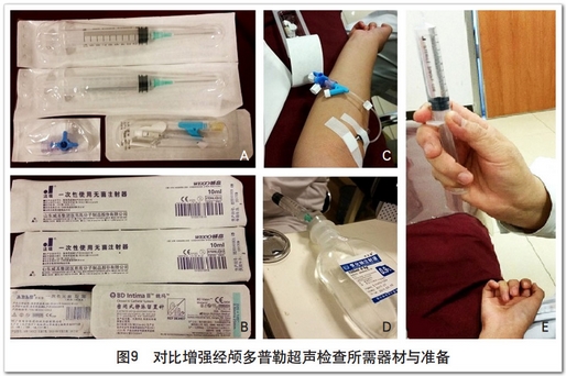 TCD设备需要带有栓子监测软件、实时的秒表、血流监护曲线,最好还有M模。配备常规的2 MHz探头、1.6 MHz探头或者监测所用的2 MHz探头均可。头架用或不用均可。使用头架,防止患者Valsalva动作幅度过大,血流信号丢失。如果不用头架,医生的手一定要扶稳探头,防止监测信号丢失。其他所需工具包括2支10 ml注射器、1个三通、1个18G套管针、1瓶0.9%生理盐水(图9)。