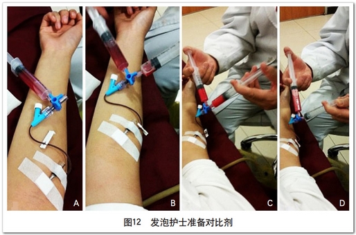 (3)在患者的肘静脉用18G针头留置通路,然后接三通,三通分别接两支注射器。两支10 ml注射器,第一支装有9 ml生理盐水,吸1 ml空气(从生理盐水瓶内直接抽取洁净的空气),并回吸一滴患者的血液,在两个注射器间来回推注20次,使盐水、空气、血液混合均匀,成为激活的生理盐水(图12)。