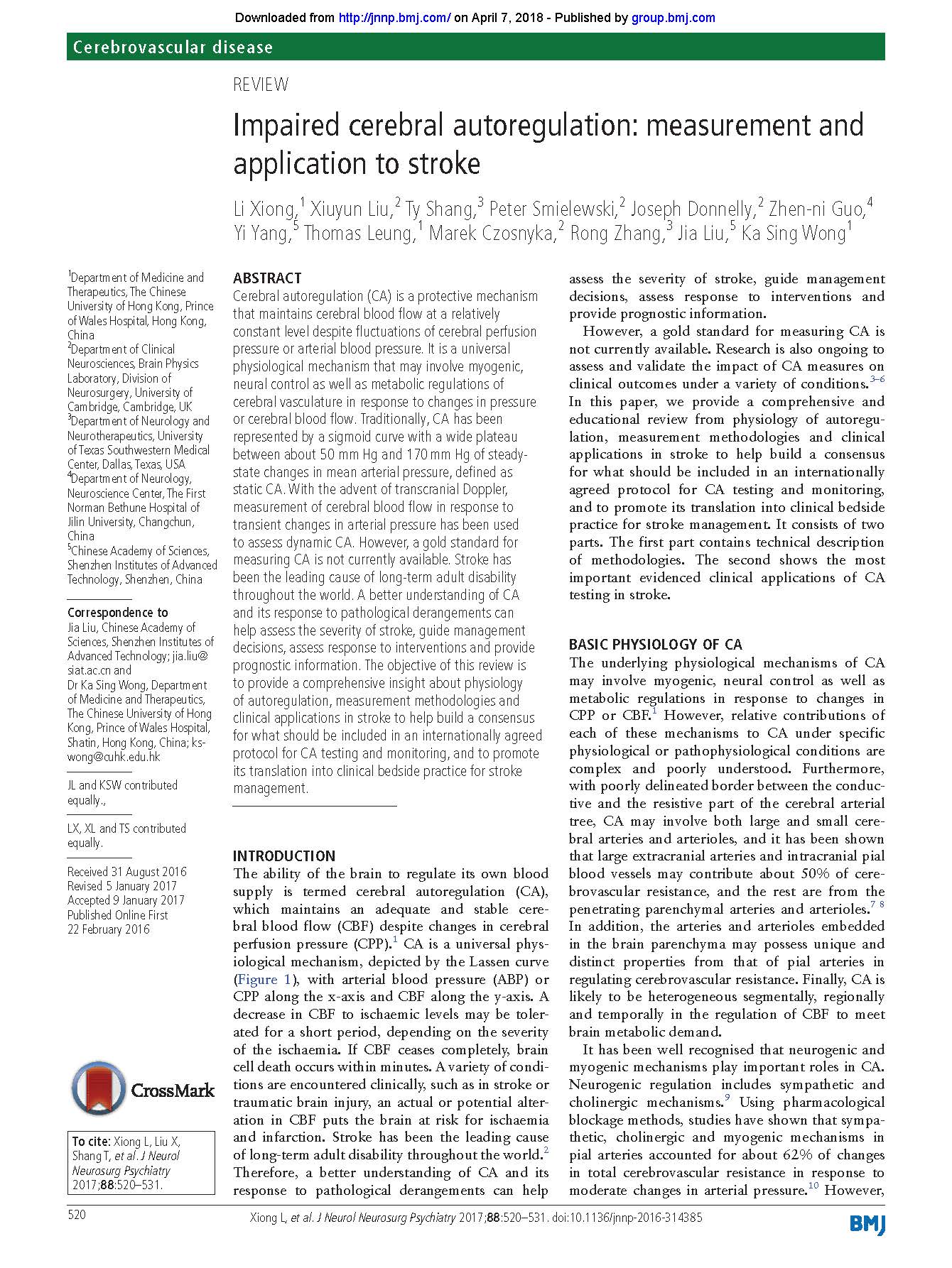 作者:Li Xiong, Xiuyun Liu, Ty Shang, Peter Smielewski, Joseph Donnelly, Zhen-ni Guo,Yi Yang, Thomas Leung, Marek Czosnyka, Rong Zhang, Jia Liu, Ka Sing Wong