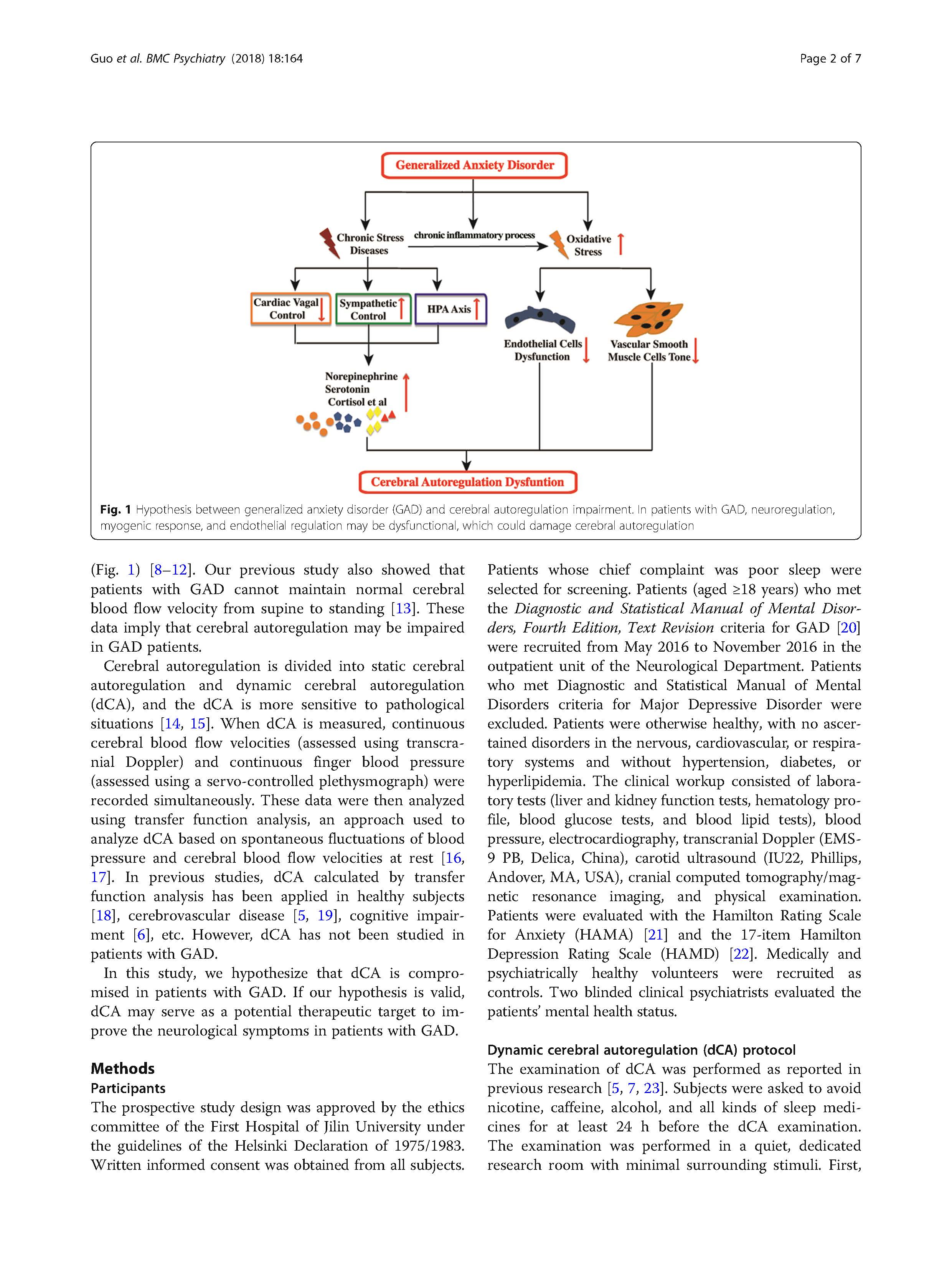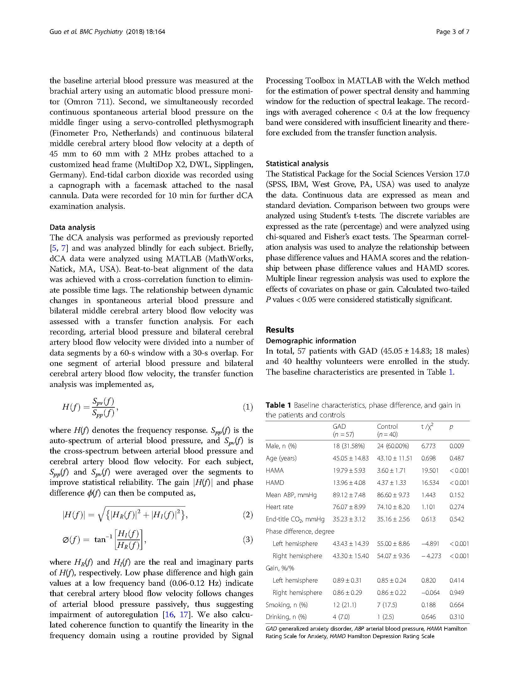 方法:被诊断为GAD的患者(年龄≥18岁)被纳入本研究。招募医学和心理健康志愿者作为对照。受试者接受汉密尔顿焦虑量表(HAMA)和17项汉密尔顿抑郁量表(HAMD)评估。每个受试者同时记录无创连续动脉血压和双侧大脑中动脉血流速度。