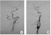1.1对象2011-08至2012-02在我院住院的缺血性脑卒中患者,经脑血管造影筛选出年满18周岁、颈内动脉迂曲(颈内动脉弯曲如螺旋状或有2个或2个以上的弯曲)、而无狭窄或闭塞的患者30例(迂曲组,图1A),无颈内动脉迂曲、狭窄或闭塞的患者30例(无迂曲组,图1B)。所有患者在脑血管造影前均签署手术知情同意书。