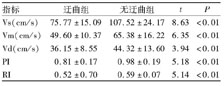 指标迂曲组无迂曲组tPVs(cm/s)75.77±15.09107.52±24.178.63<0.01Vm(cm/s)49.60±10.3765.38±16.226.35<0.01Vd(cm/s)36.15±8.5544.32±13.603.94<0.01PI0.81±0.170.98±0.195.18<0.01RI0.52±0.700.59±0.075.14<0.013讨论
