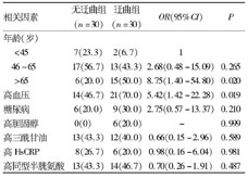 (n=30)OR(95%CI)P年龄(岁)<45 7(23.3)2(6.7)146~6517(56.7)13(43.3)2.68(0.48-15.09)0.265>65 6(20.0)15(50.0)8.75(1.40-54.80)0.020高血压14(46.7)21(70.0)5.42(1.42-22.28)0.019糖尿病6(20.0)9(30.0)2.75(0.57-13.37)0.210高胆固醇0(0) 6(20.0)-0.999高三酰甘油13(43.3)12(40.0)0.66(0.15-2.96)0.589高HsCRP8(26.7)6(20.0)0.98(0.16-6.04)0.981高同型半胱氨酸13(43.3)14(46.7)0.70(0.26-1.91)0.487