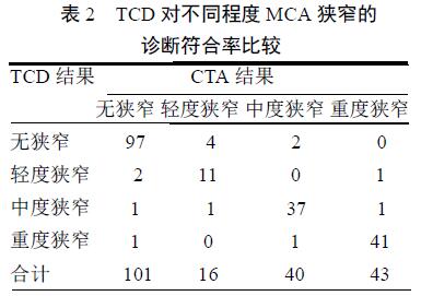 2.3 TCD 对不同程度MCA 狭窄的诊断符合率比较200 条MCA 血管CTA诊断狭窄99 条,包括轻度狭窄16 条、中 度狭窄40 条、重度狭窄43 条,TCD 对轻度、中度、重度狭窄诊断符合率分别为68.75%、92.50%、95.35%,中度、重度狭 窄诊断符合率显著高于轻度,差异均有统计学意义( 2=5.265、5.337,均<0.05)。见表2。