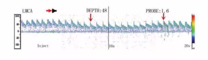 培训并熟练操作的护士组成。操作流程:①监测左侧大脑中动脉(LMCA),设置为双深度模式(取样容积10,深度差12),选取深度在48~52/60~64mm;②显示血流监护曲线,帮助判断Valsalva动作的完成效力,有效的Valsalva动作的血流曲线表现为先下降再升高(见图1);③患者取仰卧位,肘静脉留置通路,接三通开关,三通开关分别接两支10ml注射器,其中一支装有9ml生理盐水+1ml清洁空气并回抽一滴患者的血液[3],然后两个注射器来回推注20次,制作成混血激活生理盐水;④单通道监测模式进行记录,按下秒表,将混血激活生理盐水“弹丸”式全部注射,记录推注后20s内的血流及栓子信号情况;⑤间隔2分钟;⑥再次进入监测记录模式,再次推注混血激活盐水,嘱患者在推注后5秒做Valsalva动作,即深吸气后屏气10s,再呼气,观察TCD屏幕20s内的血流及栓子信号情况;⑦间隔2分钟,重复步骤⑥一次。