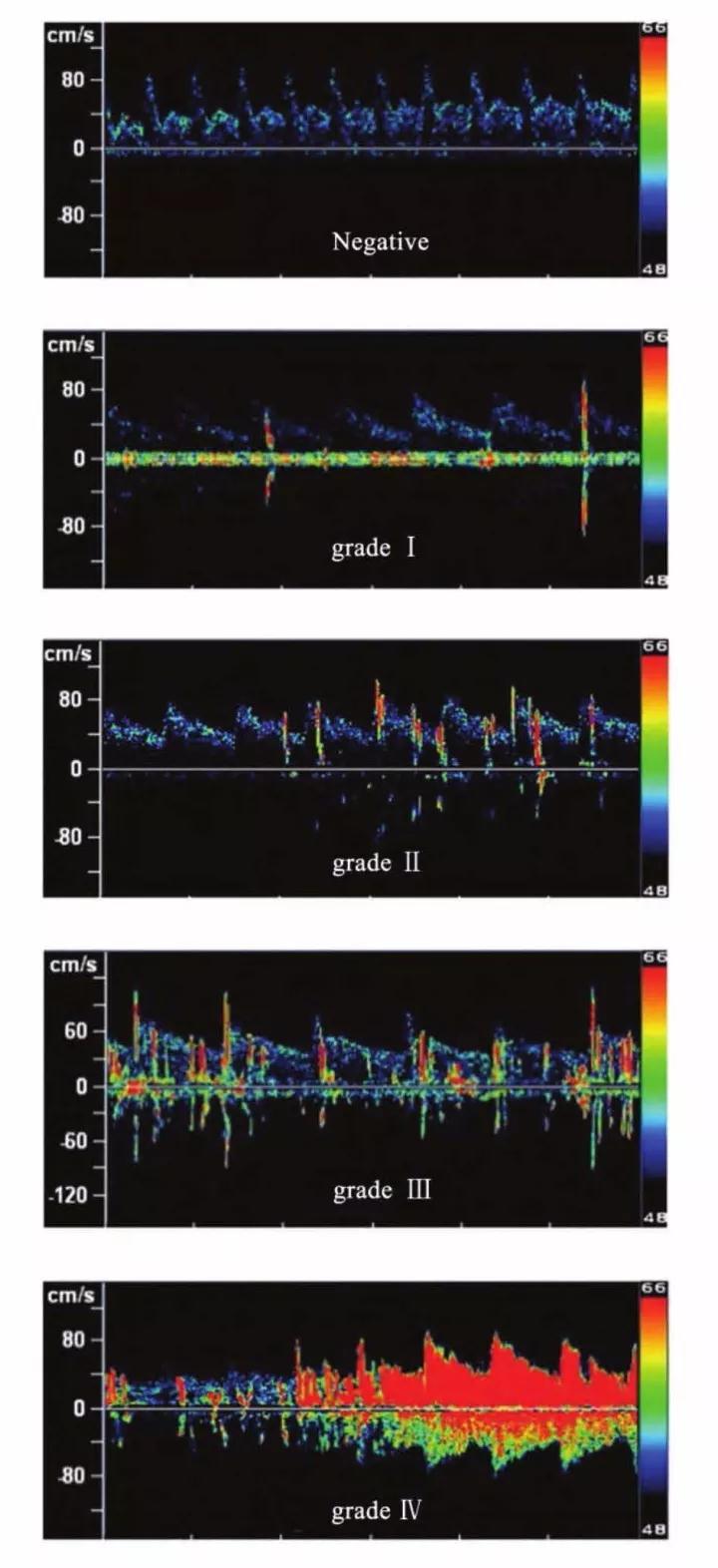 所有研究对象的RLS的诊断及分流量由1名神经内科医师和1名TCD技术员共同判断,且他们对研究对象的诊断分组不知情。RLS分流量的分级办法是根据吉林大学第一医院邢英琦等提出的5级分级法[4]:①无分流:0个微泡信号;②Ⅰ级分流:1~10个微泡信号,即小量分流;③Ⅱ级分流:11~25个微泡信号,即中量分流;④Ⅲ级分流:大量分流,>25个微泡信号但未形成雨帘状;⑤Ⅳ级分流:雨帘状大量分流,无法精确计算的大量微泡信号(见图2)。RLS的分型:①固有型:静息状态下就能检测到微泡信号;②潜在型:静息状态下无微泡信号,Valsalva动作后才能检测到微泡信号。