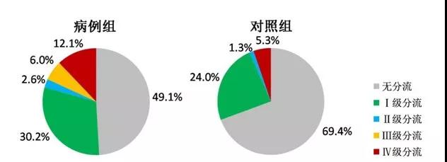 2.1 病例组和对照组的RLS阳性率及分流量如下。在病例组中,RLS的阳性率为50.9%(59/116),其中,Ⅰ级分流35例(30.2%),Ⅱ级分流3例(2.6%),Ⅲ级分流7例(6.0%),Ⅳ级分流14例(12.1%)。对照组中,RLS的阳性率为30.6%(23/75),其中,Ⅰ级分流18例(24.0%),Ⅱ级分流1例(1.3%),Ⅲ级分流0例(0%),Ⅳ级分流4例(5.3%)。以上率的分布见图3。