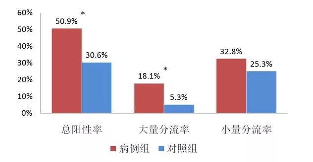 图4 两组RLS总阳性率、大量分流率、小量分流率的比较(*代表有显著差异)