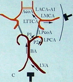 确认试验:①由于PCA 供应枕叶视觉皮层,睁闭眼试验有助于识别PCA。闭眼时PCA血流速度下降,睁眼时(可同时用手电近距离照射)血流速度增高;②压同侧CCA 后血流速度不变或增高。压颈动脉试验后PCA 血流速度增高或不变的前提是该PCA 由BA 供血,血流增高说明PcoA 存在,血流速度不变说明PcoA 先天发育不良。PCA 变异非常常见,其中一个主要变异是ICA 参与供血。