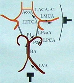 确认试验:压迫同侧CCA时MCA血流速度下降。当PCA起源于同侧ICA 时,压同侧CCA时PCA 血流速度亦下降。此时鉴别两血管的主要依据为检测的角度,检测PCA 时探头角度明显朝向后枕部。如果该PCA 由ICA 供血,则睁闭眼试验有助识别。