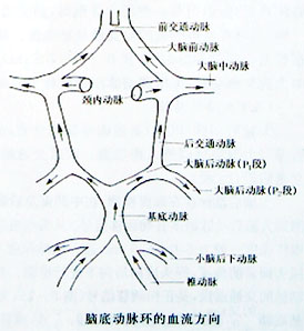 在生理情况下,脑底动脉的各血管血流都有各自的血流方向,互相之间不会混杂,脑底动脉的各血管血流方向如图。 血流方向是判别颅内各血管的主要依据之一。