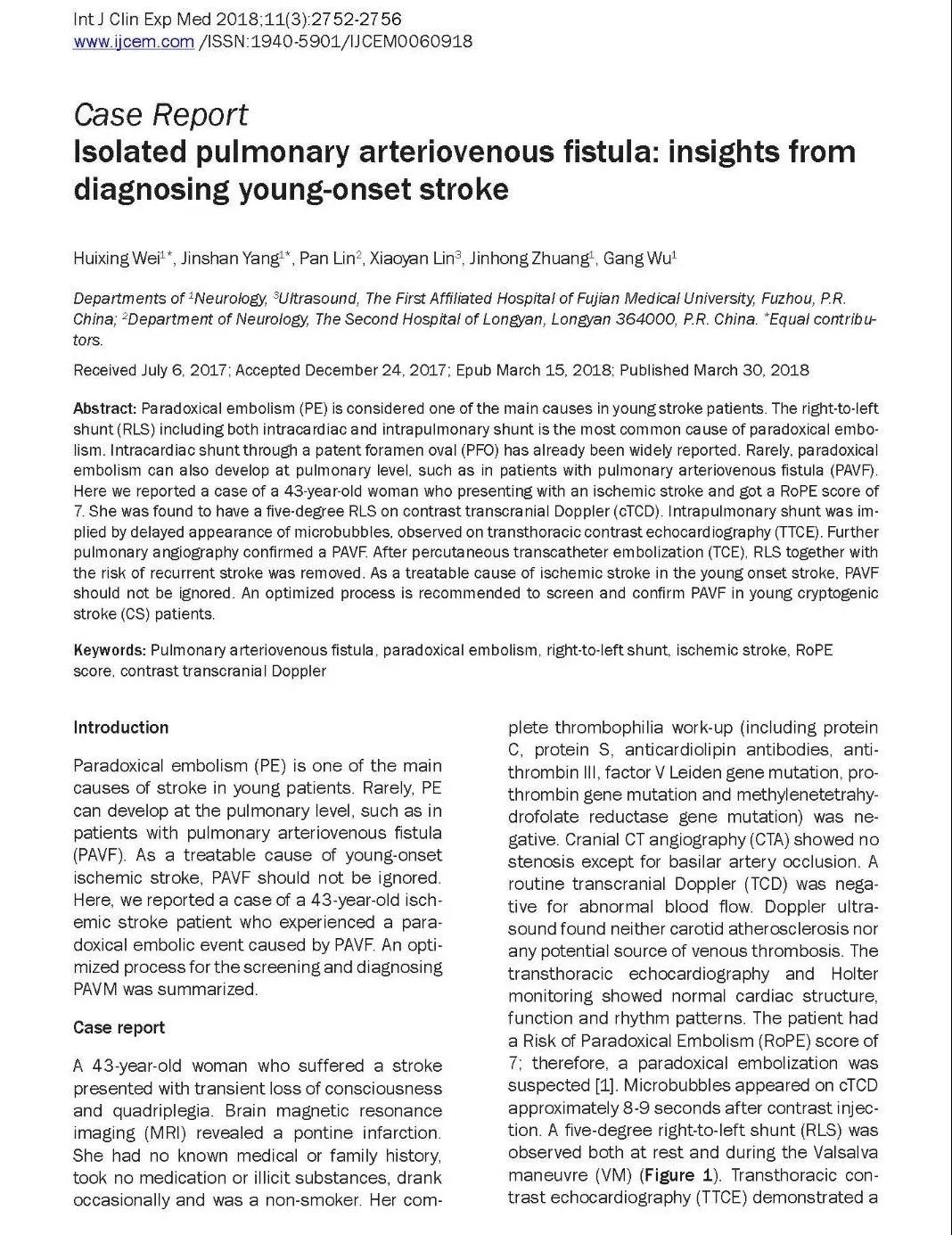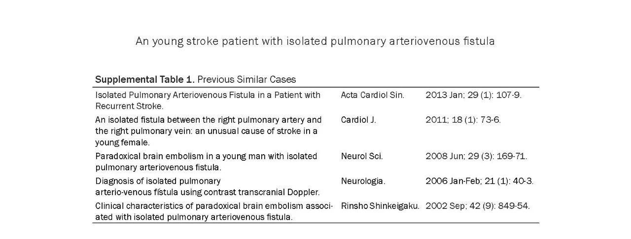 反常栓塞(Paradoxical embolism,PE)被认为是诱发青年卒中的主要因素之一。心脏和肺内的血液右向左分流(right-to-left shunt,RLS)则是导致反常栓塞的最常见原因。心腔内通过卵圆孔(patent foramen oval,PFO)的RLS已经被大量文献报道。虽然肺内的RLS也会引发反常栓塞,例如肺动静脉瘘(pulmonary arteriovenous fistula,PAVF)的患者,但是却鲜见报道。