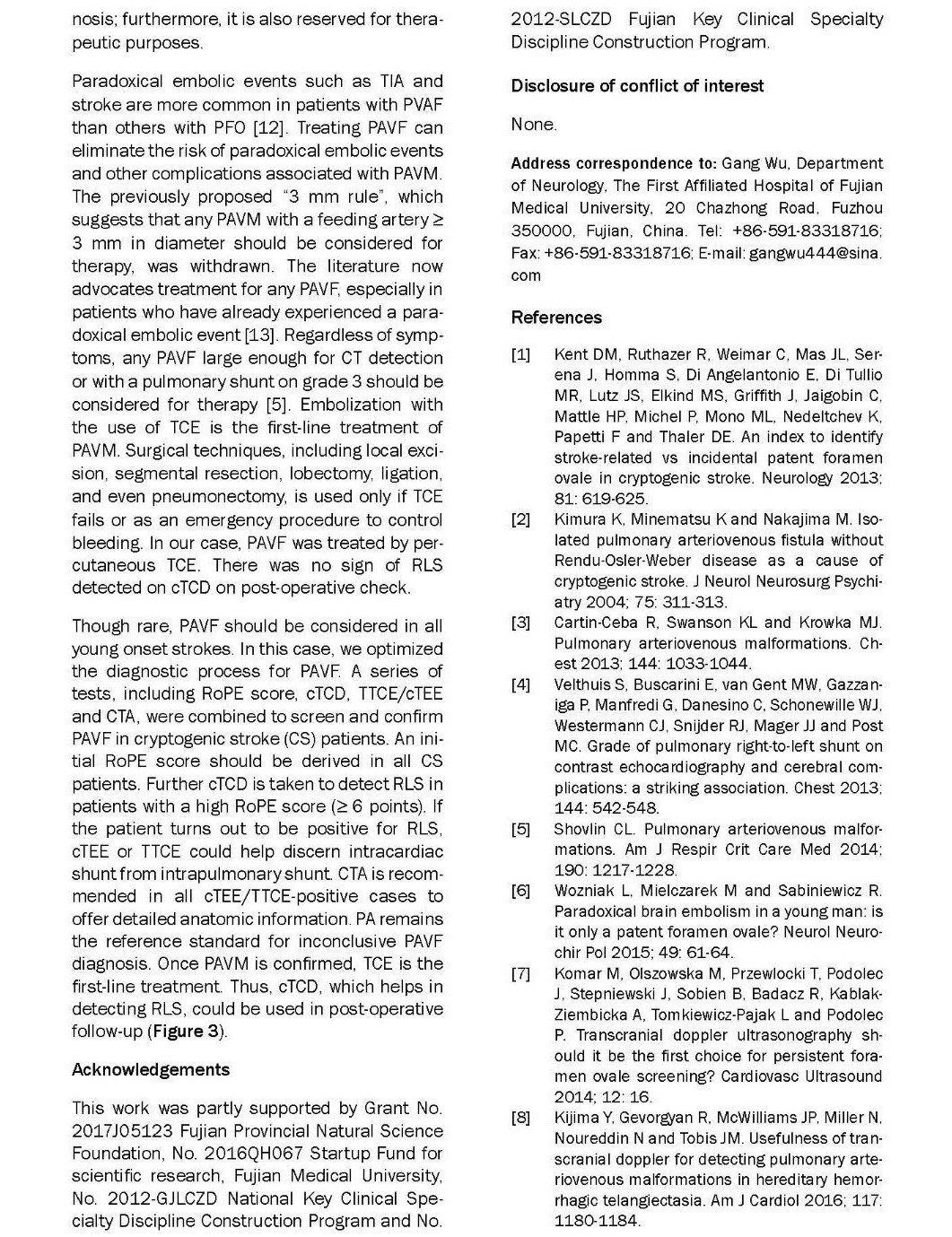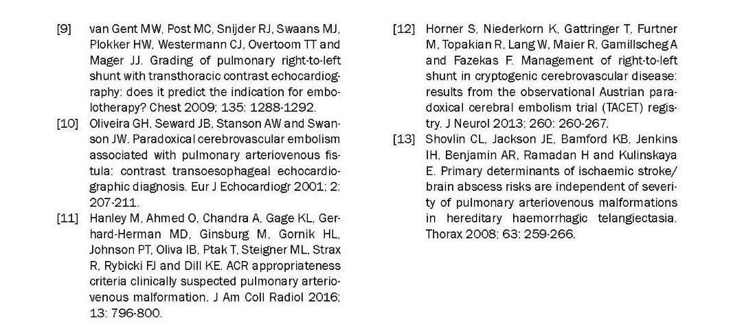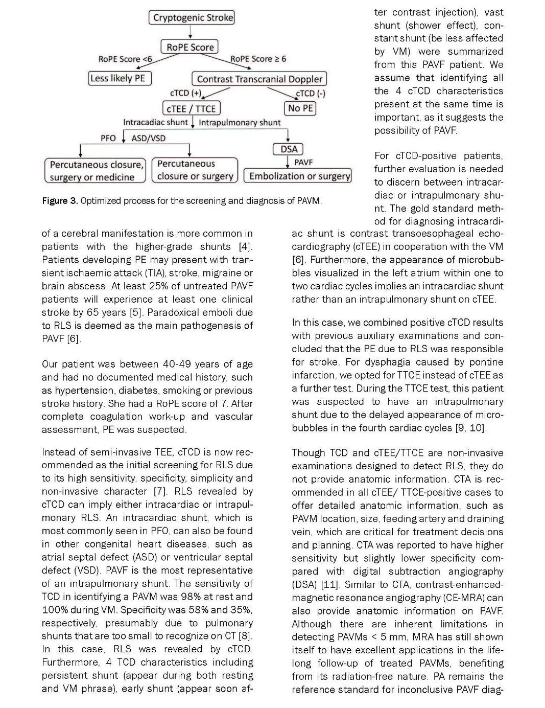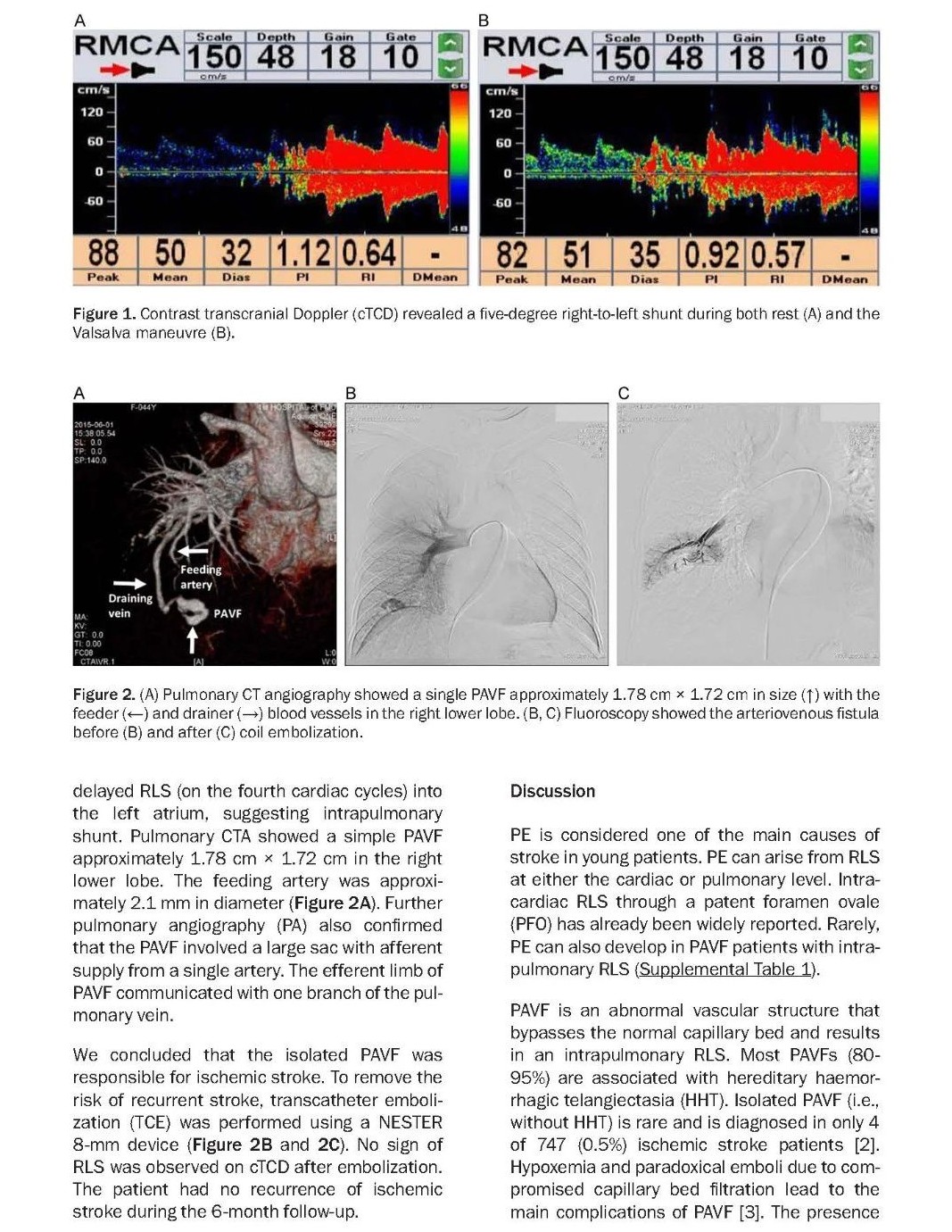 本文中我们报道了一例43岁缺血性中风患者,她的RoPE评分为7分。通过对比增强经颅多普勒成像(contrast transcranial Doppler,cTCD),诊断其为5度RLS。通过对比增强经胸超声心动图(transthoracic contrast echocardiography,TTCE)观察到气泡的延迟出现,证实了肺内分流的存在。进一步的肺内血管造影证实了PVAF。经皮导管栓塞术(percutaneous transcatheter embolization,TCE)后,RLS与继发卒中的风险被一并消除。